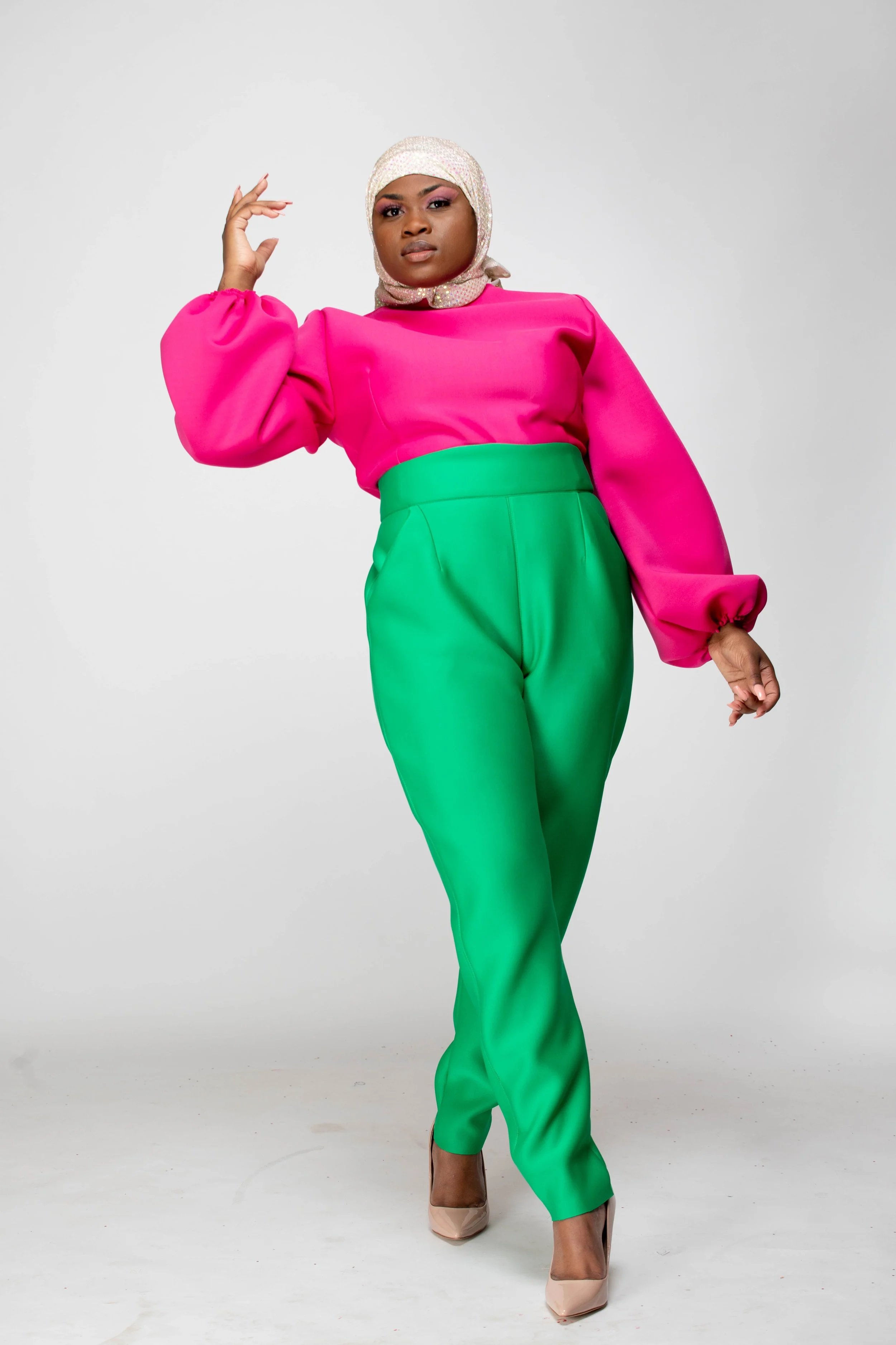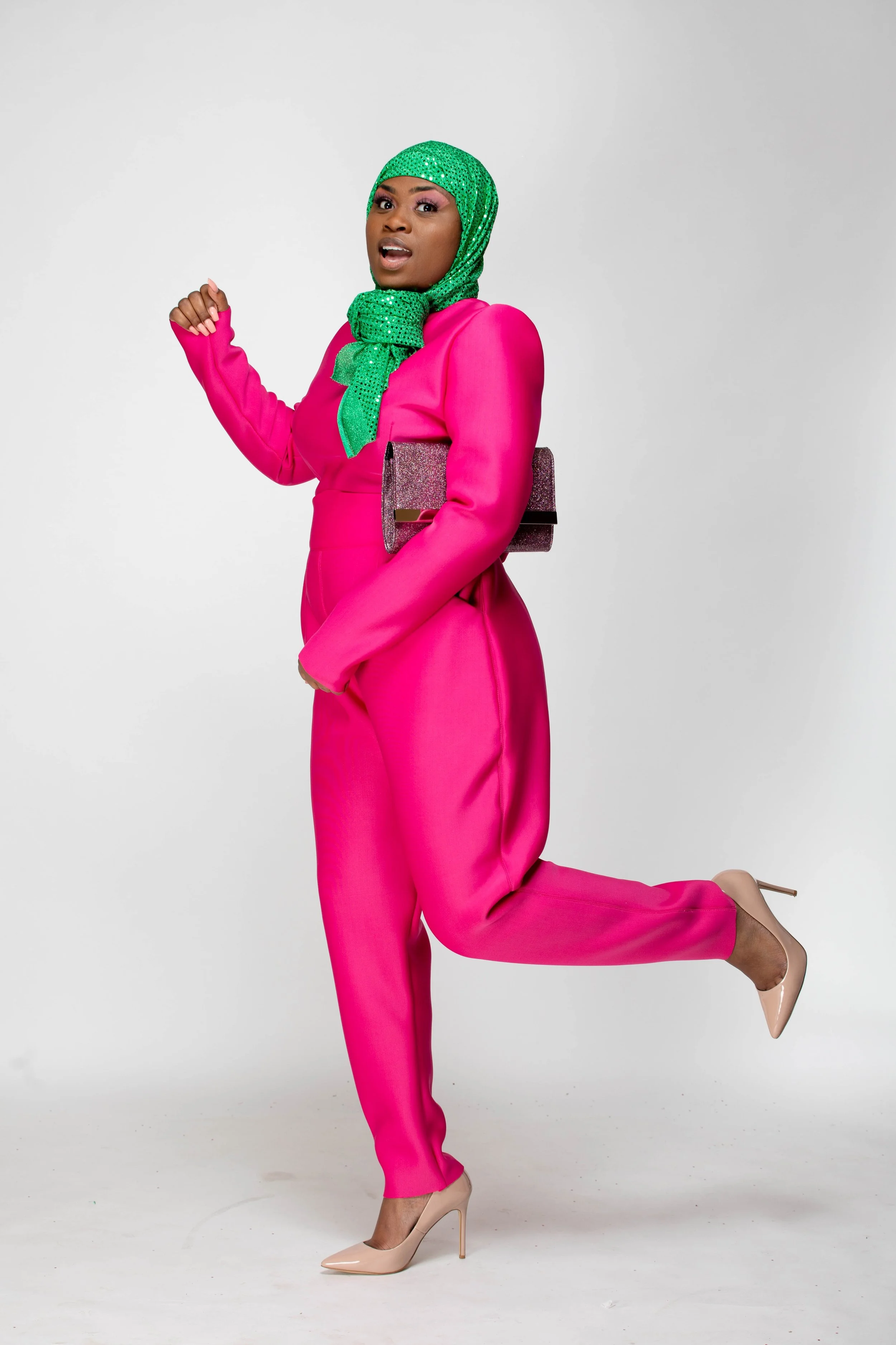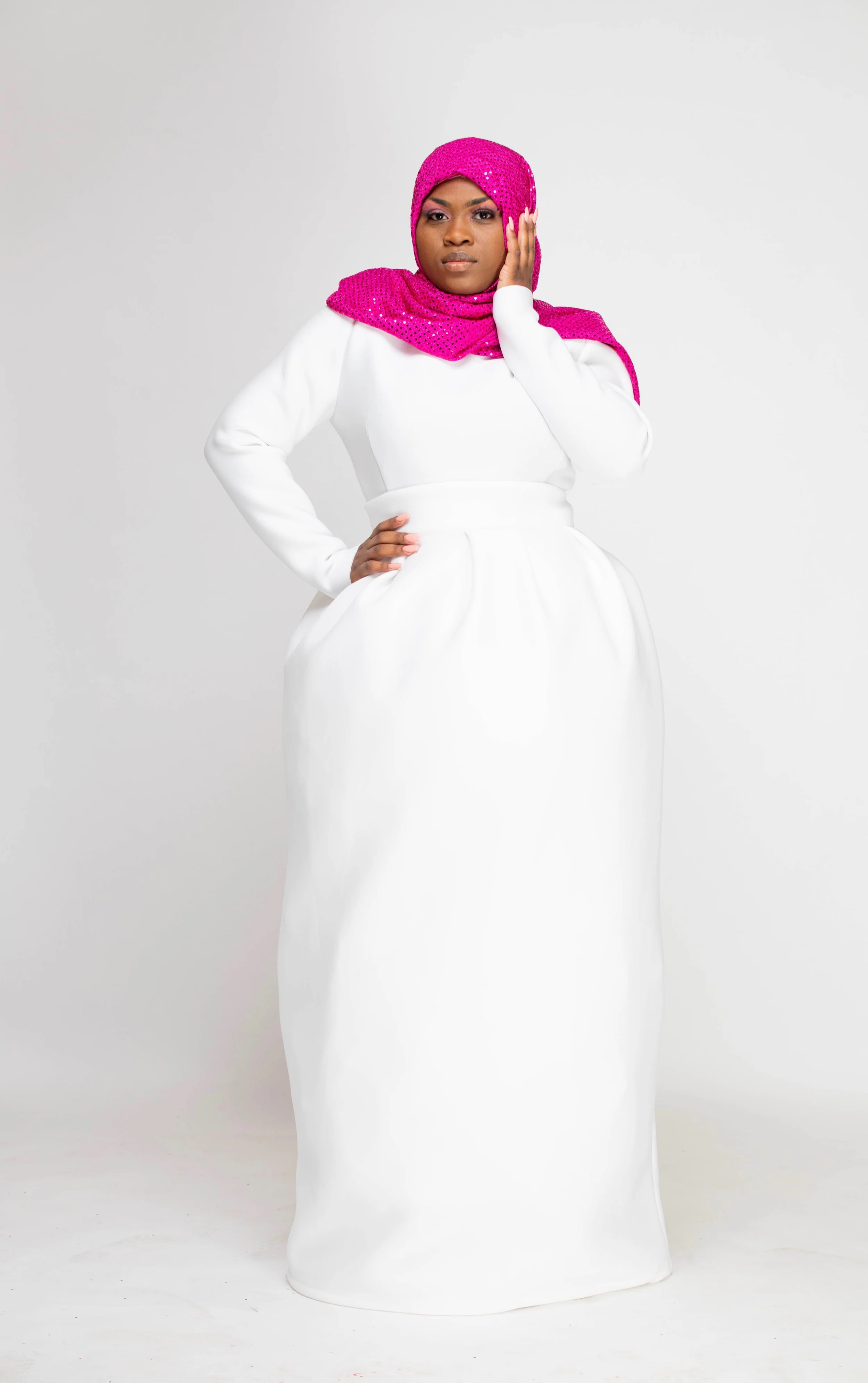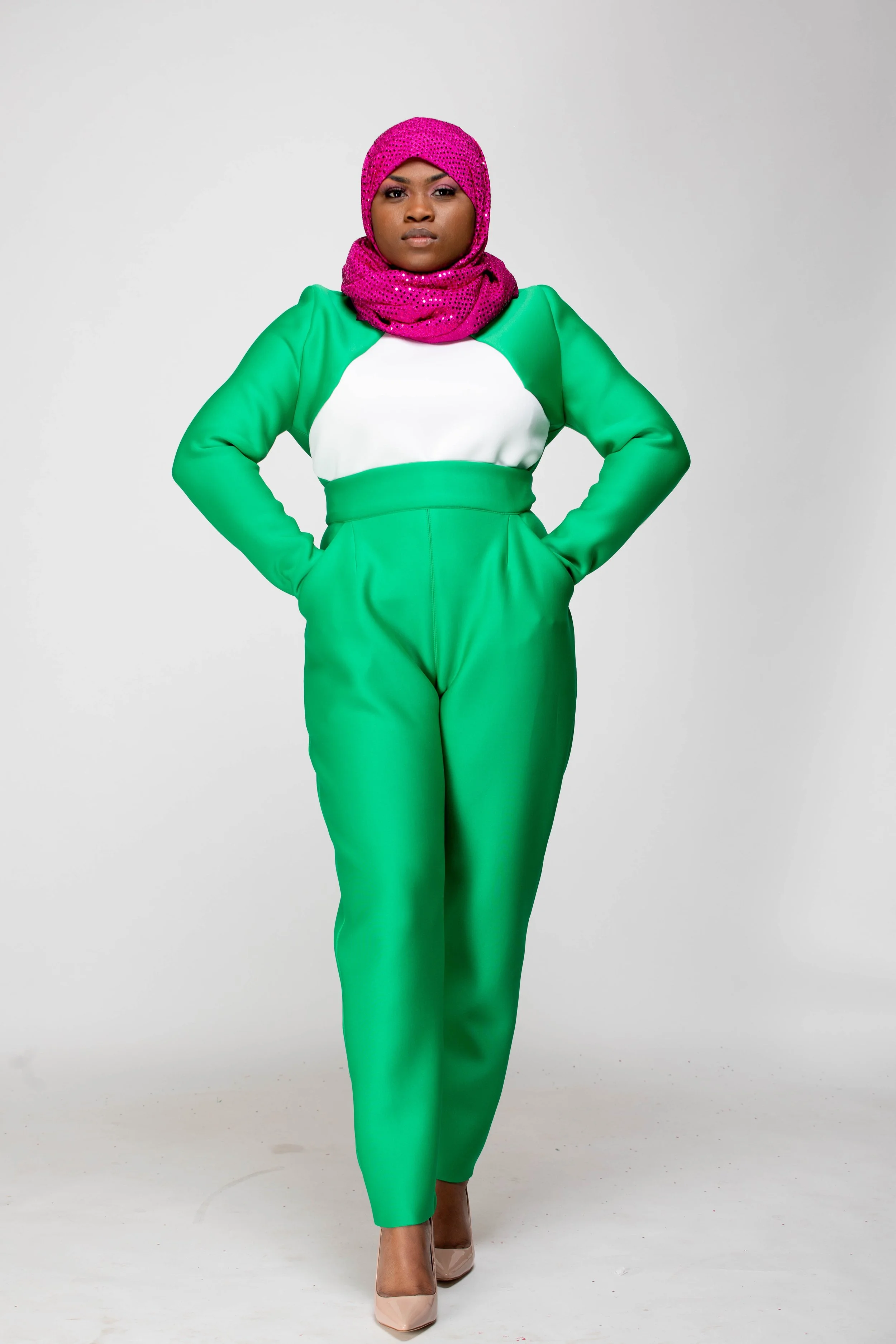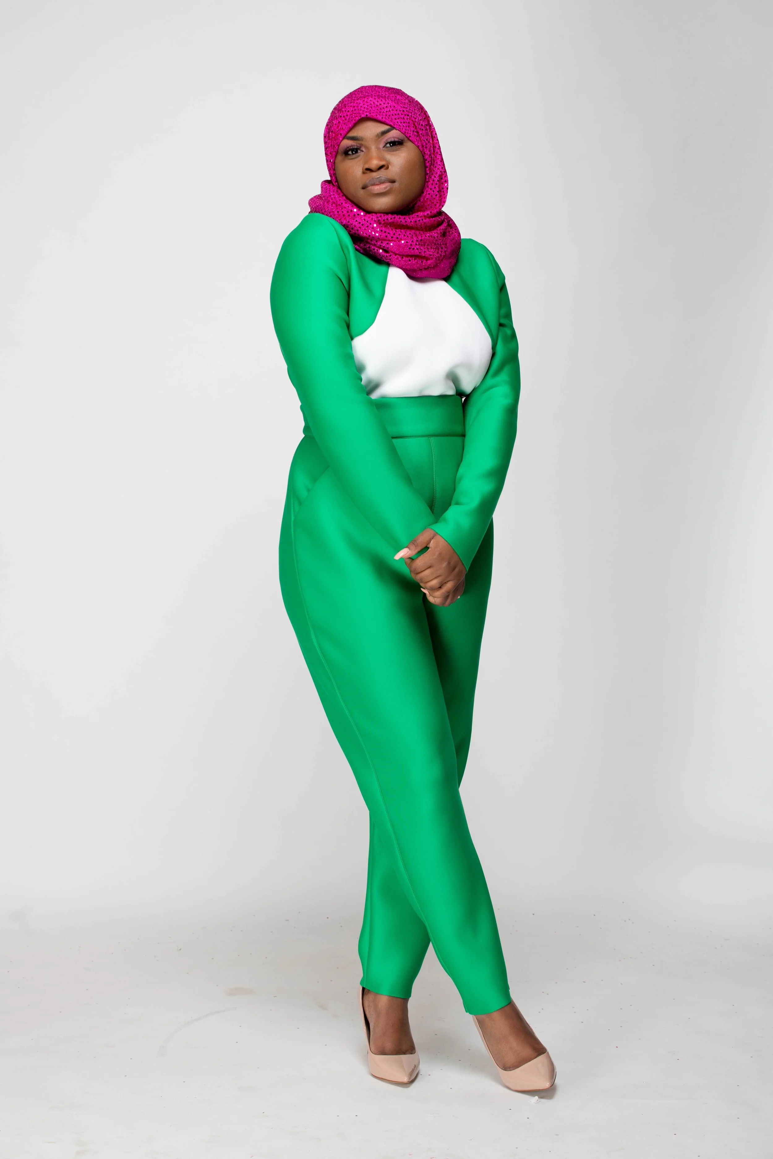 The color palette honors Mrs. Beyah’s Alpha Kappa Alpha lineage, the PHirst sorority of the Divine 9, just as Mrs. Beyah was the first to see my potential. The hijab and silhouettes reflect her Muslim grace, the way she merges modesty and modernity with effortless elegance. Even the unedited photographs echo her “professional authenticity,” teaching me that truth is its own beauty.