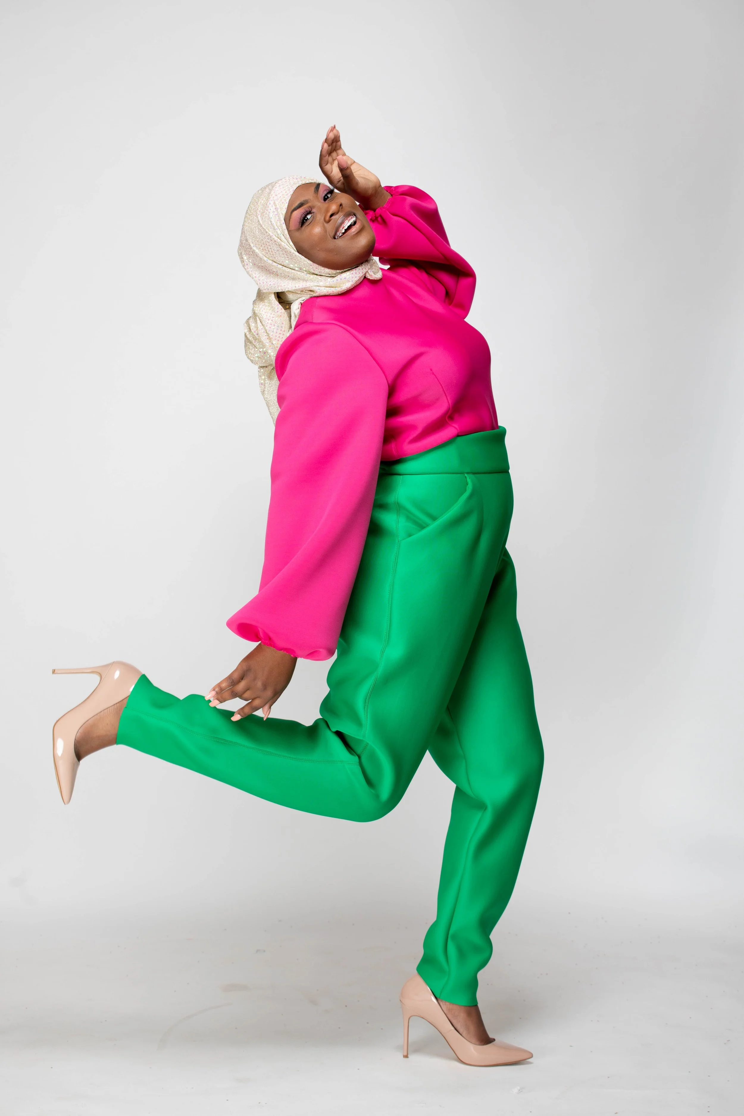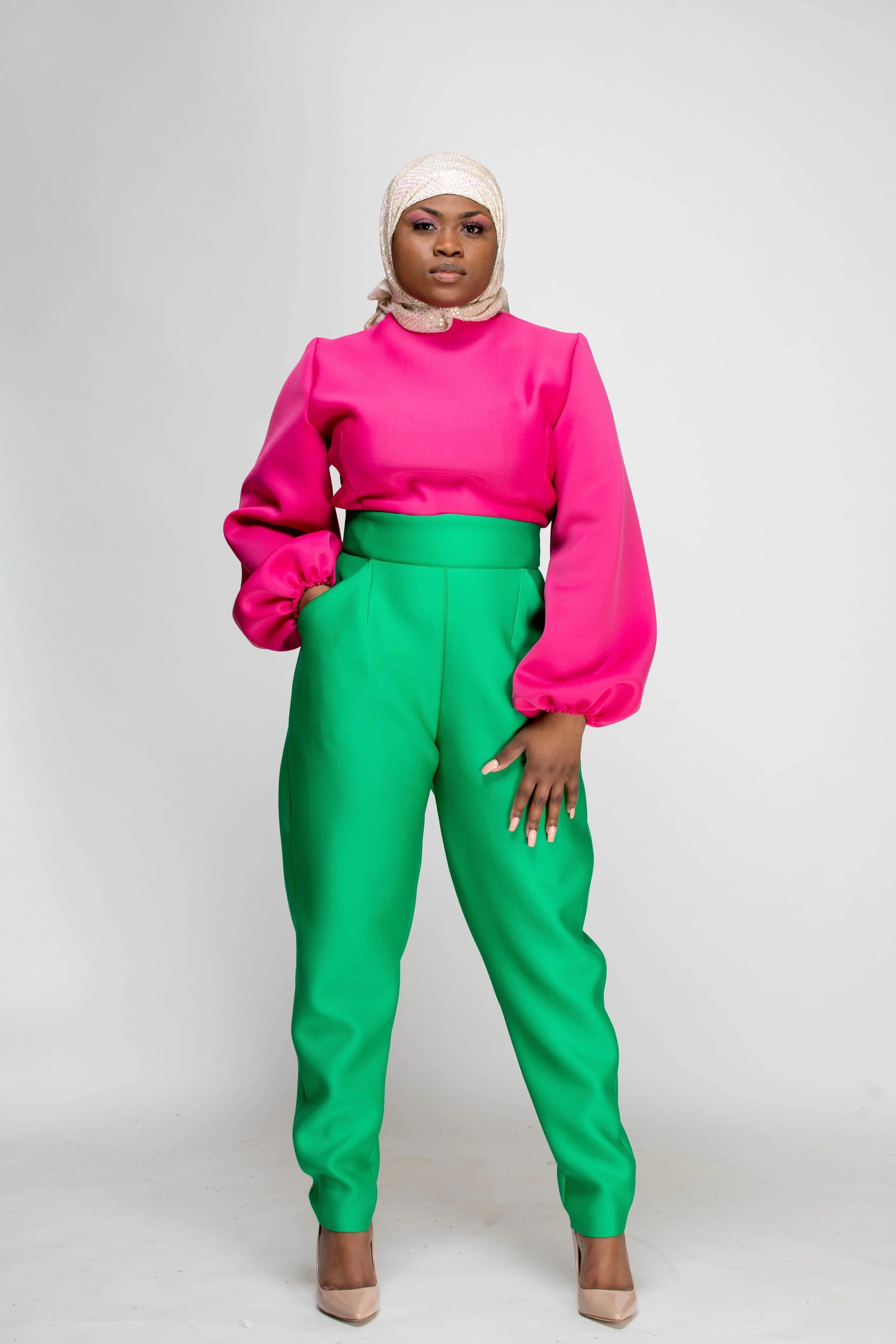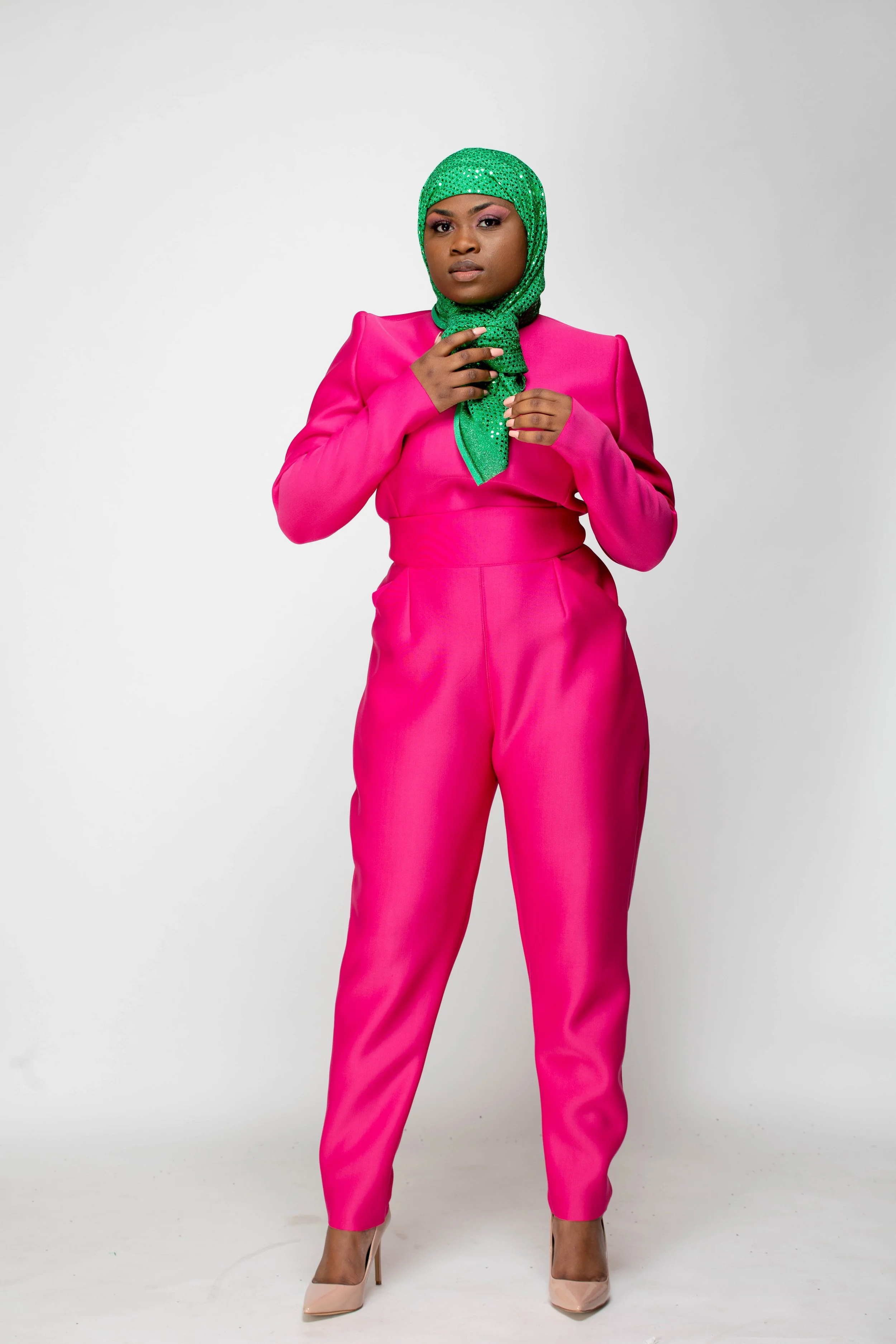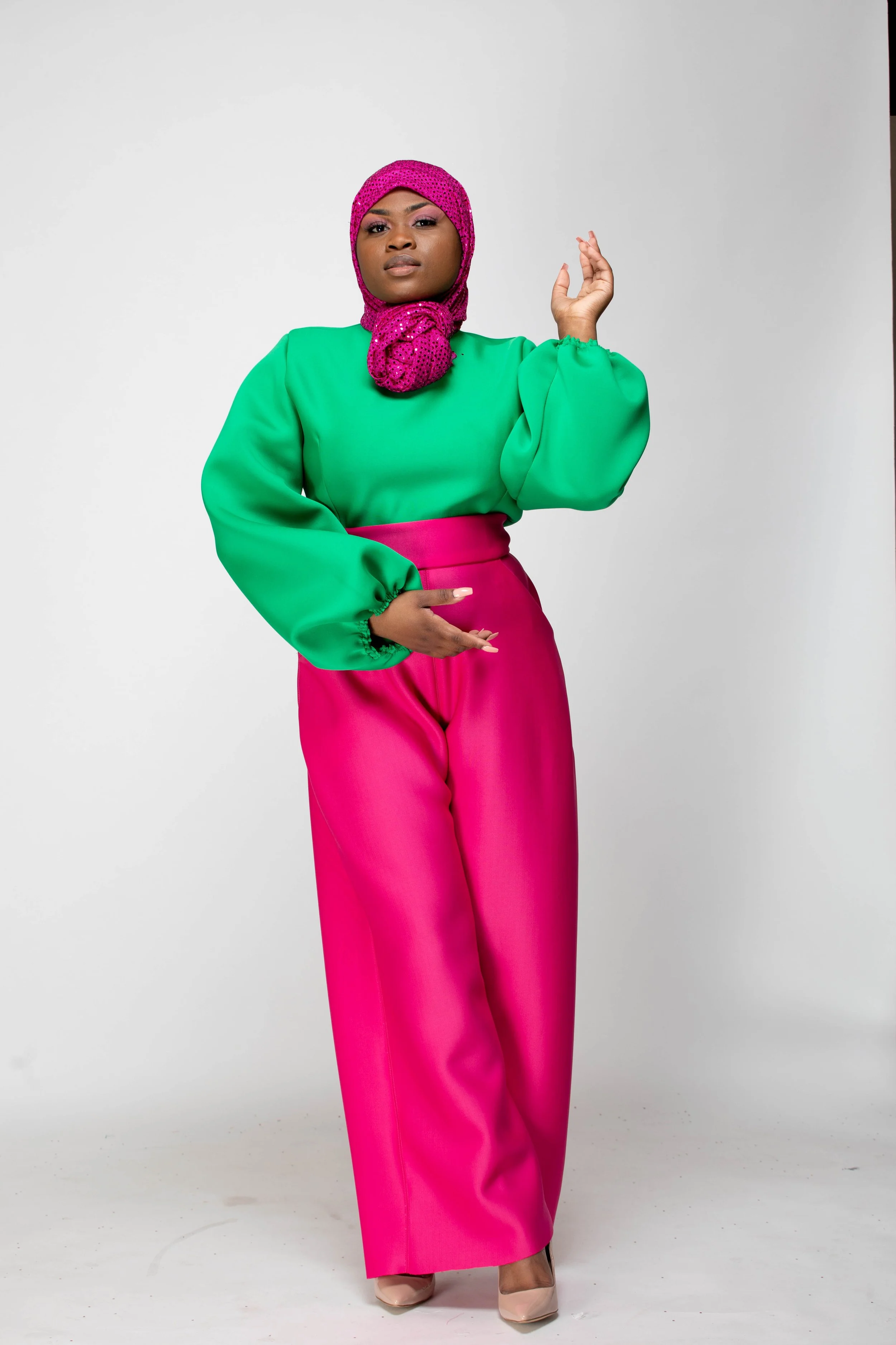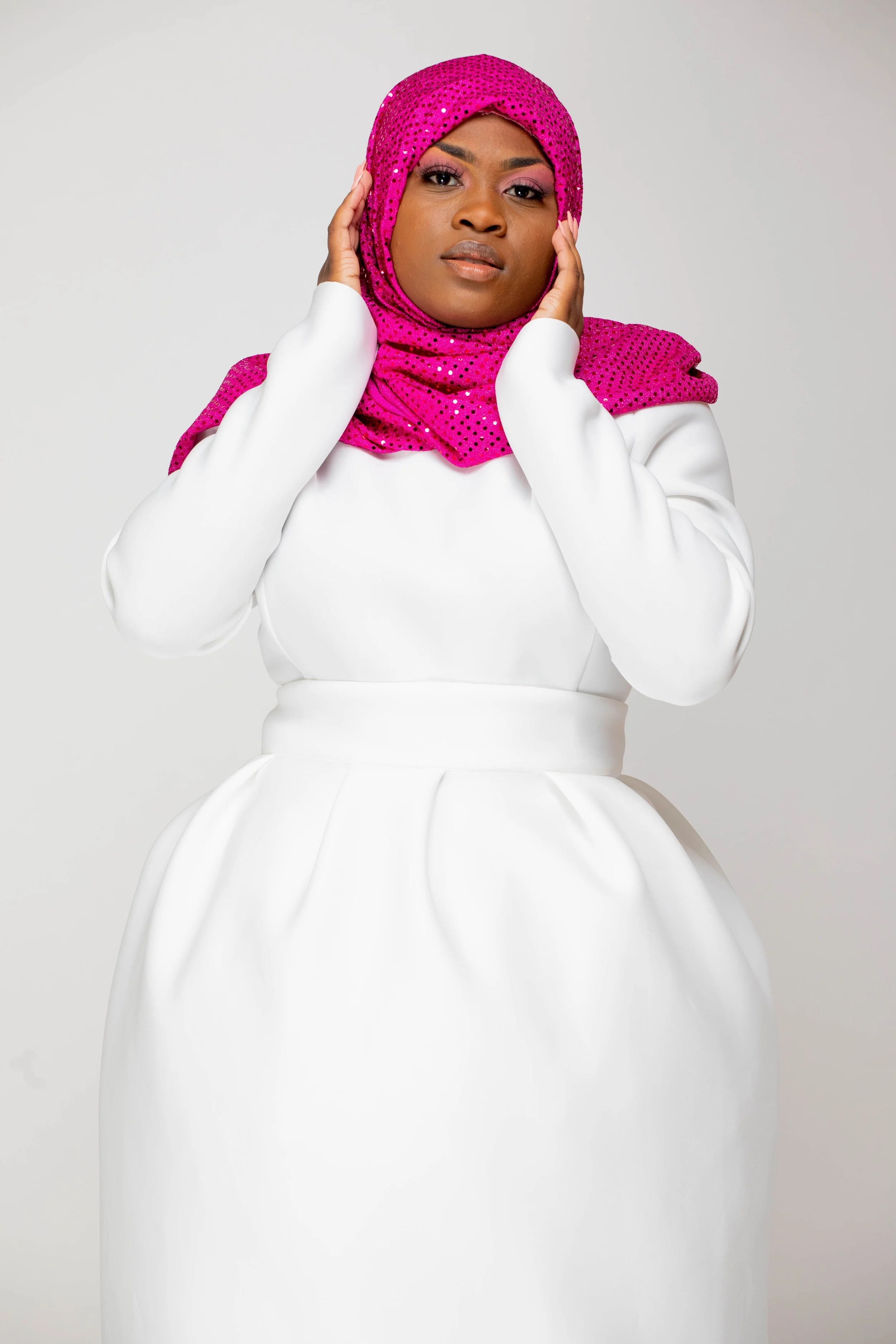 The color palette honors Mrs. Beyah’s Alpha Kappa Alpha lineage, the PHirst sorority of the Divine 9, just as Mrs. Beyah was the first to see my potential. The hijab and silhouettes reflect her Muslim grace, the way she merges modesty and modernity with effortless elegance. Even the unedited photographs echo her “professional authenticity,” teaching me that truth is its own beauty.